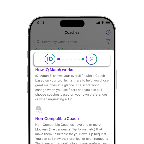 Stop scrolling and second-guessing. Our IQ Match™ algorithm displays a clear percentage fit with every Coach - based on data, not opinions. It gives you instant clarity, confidence in your choice, and a faster path to the right advice.