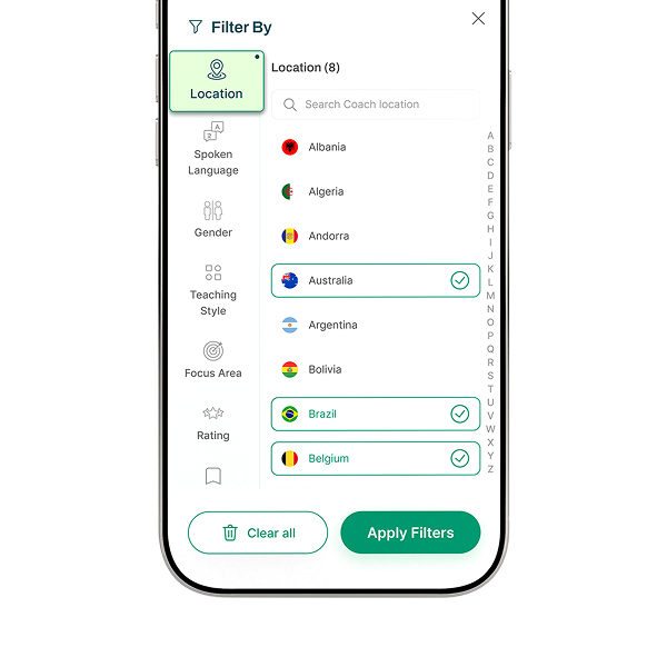 Search for a Coach by name, or use our powerful filter to refine by Qualification, Location, Language and much more. Sort by Price, Average Response Time or Rating - and save your favourites to find them quickly.
