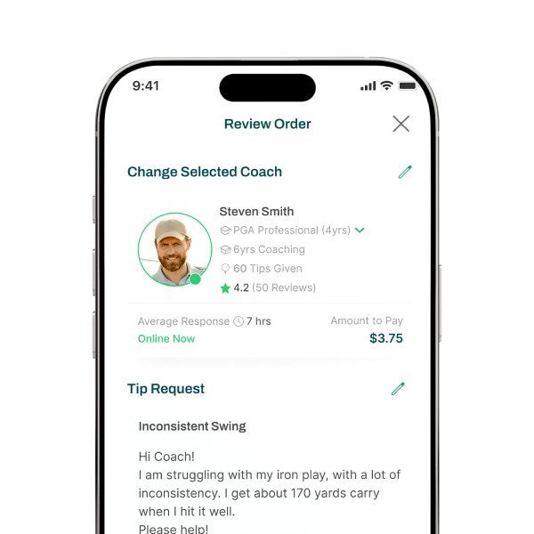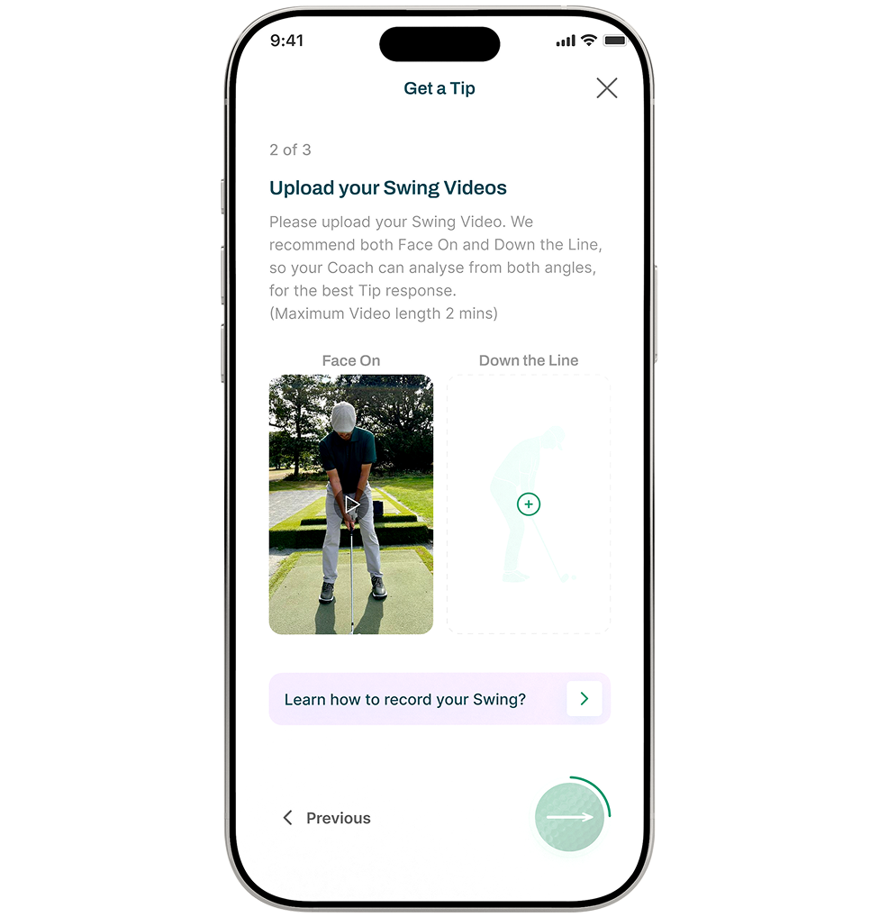 Record one or two swings, add an optional short note, and get a personalised Tip from your Coach - clear, direct, and fast. Each Tip takes only a few minutes of the Coach’s time, so you receive focused feedback plus one concise clarification if needed.No long chats. No ongoing threads. Just a single, sharp fix you can apply right away.