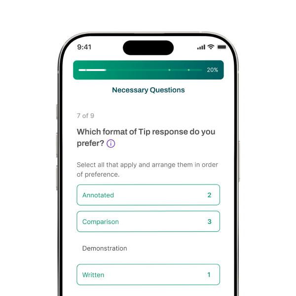 A swift onboarding captures the essentials - your preferences, goals and constraints - so every Tip is truly made for you. These details appear on each Tip request, so Coaches understand you before they reply.